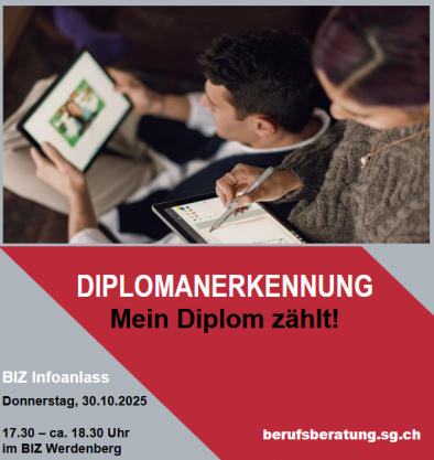 Veranstaltungskalender neues Fenster der Berufs-, Studien- und Laufbahnberatung des Kantons St.Gallen und melden Sie sich an!