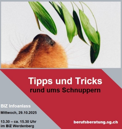 Du willst bald schnuppern gehen und dich gut auf die Lehrstellensuche vorbereiten? Dann ist diese Veranstaltung genau richtig für dich! Sie richtet sich an Schüler und Schülerinnen der 2. Oberstufe. Deine Eltern dürfen gerne mitkommen.
