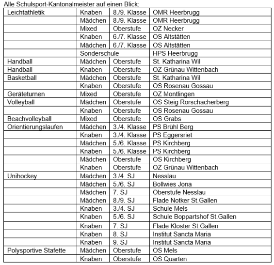 Das Handballturnier fand aufgrund der anstehenden Ferien ohne St.Galler Beteiligung statt. In der Leichtathletik vertraten Teams der Oberstufenschulen Gossau (Buechenwald), Neckertal und Heerbrugg den Kanton St.Gallen. Die Mädchen der OMR Heerbrugg gewannen Silber in der Kategorie 8./9. Klasse. In einem sehr hochstehenden Wettkampf bei den Knaben 8./9. Klasse klassierten sich die Jungs aus Heerbrugg im 5. Schlussrang. Bei den 6./7.-Klässlern erreichte das Mädchenteam des OZ Buechenwald Gossau den sehr guten 4. Rang und bei den Knaben dieser Kategorie erreichte das Team der Schule Neckertal den 7. Schlussrang.