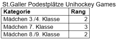 Die offiziellen Schul-Schweizermeisterschaften im Unihockey mit ihren kantonalen Ausscheidungsturnieren und dem Finalturnier in Zofingen sind mit rund 15'000 Teilnehmerinnen und Teilnehmern das grösste Unihockeyturnier der Schweiz. An den Finaltagen in Zofingen kämpften auch in diesem Jahr wieder rund 1'000 Schülerinnen und Schüler um den Schülermeistertitel im Unihockey. Gleich in drei Kategorien standen dabei die St.Galler-Teams auf dem Siegerpodest.