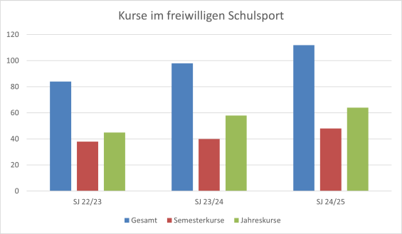 Im Schuljahr 2024/25 boten 32 Schulen im Kanton St.Gallen 112 J+S-Kurse im freiwilligen Schulsport an. Dies entspricht 14 Kursen mehr als im Vorjahr. Mit 48 Semester- und 64 Jahreskursen gab es eine leichte Verschiebung hin zu mehr Semesterkursen. Bei gleichbleibender Anzahl Schulen zeigt sich eine erfreuliche Zunahme der Kursangebote