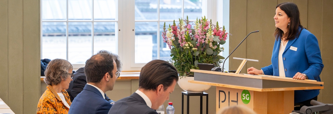 Regierungsrätin Laura Bucher, Vorsteherin des Departementes des Innern, ging in ihrem Referat auf den besonderen Stellenwert ein, den das St.Galler Rheintal in der Flüchtlingsgeschichte der Schweiz in der NS-Zeit einnimmt. Bucher betonte, wie wichtig die Vermittlung des historischen Wissens über die NS-Zeit für die Sicherung von Demokratie und Menschenrechten ist und dass es auch darum geht, gerade junge Menschen beziehungsweise Schulklassen für diese Themen zu sensibilisieren. Entsprechend war auch die Wahl des Tagungsortes nicht zufällig: Das Schulhaus Hadwig in der Stadt St.Gallen war 1945 Schauplatz der Aufnahme von Flüchtlingen und ist heute ein Standort der Pädagogischen Hochschule St.Gallen, die als Ausbildungs- und Forschungsstätte an den Projektarbeiten zum Memorial mitwirkt.