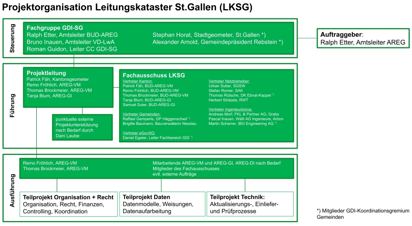 Das Projekt wird durch eGovSG neues Fenster getragen und finanziert. Die ständige Fachgruppe GDI (Geodateninfrastruktur) verantwortet die Steuerung des Projektes. Ralph Etter, Amtsleiter des AREG übernimmt dabei die Aufgabe des Auftraggebers. Die vierköpfige Projektleitung unter der Leitung des Kantonsgeometers Patrick Fäh umfasst zudem die AREG-Mitarbeitenden Tanja Blum, Thomas Brockmeier und Remo Fröhlich. Die einzelnen Aufgaben werden dabei in Teilprojekten in unterschiedlichen Zusammensetzungen nach Bedarf angegangen.