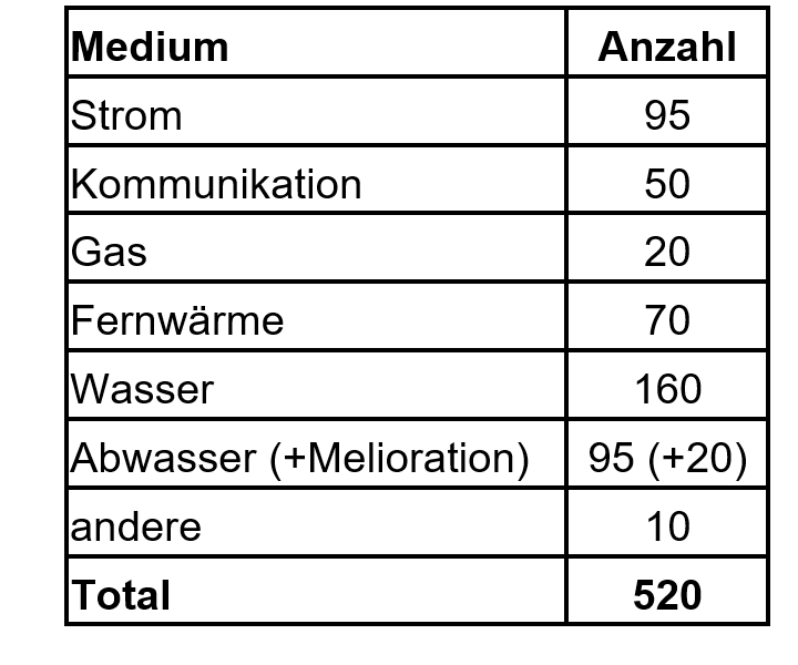 Im Rahmen der Projektinitialisierung wurde im Jahr 2024 zusammen mit den Gemeinden eine erste Erhebung der bekannten Leitungsnetze für Strom, Wasser, Abwasser, Kommunikation, Gas und Fernwärme durchgeführt. Dabei wurden etwa 520 unterschiedliche Netze verzeichnet, zu welchen im Verlauf der weiteren Arbeiten zusätzliche hinzugekommen sind. Aufgrund dieser Angaben startete die Projektleitung im März 2025 gemeinsam mit dem Projekt GDI-SG die Bestandesaufnahme 2025 in Zusammenarbeit mit sämtlichen Netzbetreibern.