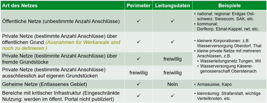 Im Kanton St.Gallen besteht eine Vielzahl an Leitungsnetzen unterschiedlicher Ausprägung. Diese reicht von nationalen Netzbetreibern wie Swisscom oder Swissgrid über regionale und kommunale Versorgungsnetze und kleinen Korporationen oder privaten Leitungsnetzen bis hin zu einzelnen Gebäudeverbindungen auf privaten Grundstücken. Eine umfassende Publikation im Kataster ist wohl mit vertretbarem Aufwand nicht möglich. Gleichwohl soll der Kataster möglichst umfassend Auskunft geben über die vorhandenen Leitungen. Deshalb wurde die Lieferpflicht für einzelne Klassen unterschiedlich geregelt und in die Pflicht zur Erfassung des Perimeters beziehungsweise zur Lieferung der Leitungsdaten unterteilt. Öffentliche Netze sowie private Netze, die über öffentlichen Grund verlaufen, müssen vollständig für den Kataster bereitgestellt werden. Ausnahmen, beispielsweise für firmeneigne Netze auf Werkarealen, müssen noch definiert werden. Auch für geheime Netze (z.B. armasuisse) gibt es Ausnahmen. Für private Netze, welche ausschliesslich über eigene oder fremde Grundstücke ohne öffentlichen Grund verlaufen, bleibt die Datenlieferung freiwillig, sie wird aber empfohlen. Für all diese Netze, mit Ausnahme der privaten Netze auf eigenen Grundstücken, ist die Erfassung des Perimeters zwingend erforderlich.