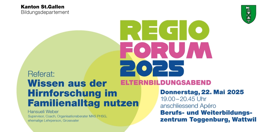 Das nächste RegioForum findet am Donnerstag, 22. Mai 2025 um 19.00 Uhr im Berufs- und Weiterbildungszentrum Toggenburg in Wattwil statt. Hansueli Weber wird zum Thema «Wissen aus der Hirnforschung im Familienalltag nutzen» referieren. Ebenfalls wird wiederum die Ideenküche vor Ort sein. Die Anmeldemöglichkeit und weitere Informationen finden Sie ab Ende Februar 2025 unter elternbildung.sg.ch neues Fenster.