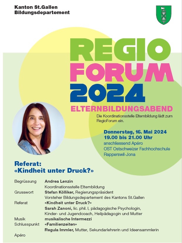 Die Koordinationsstelle Elternbildung lädt zum RegioForum 2024 ein – ein Elternbildungsabend, welcher im jährlichen Wechsel in einer anderen Region des Kantons St.Gallen stattfindet.