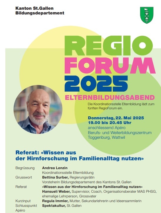 Am Donnerstag, 22. Mai 2025 um 19.00 Uhr referiert Hansueli Weber zum Thema «Wissen aus der Hirnforschung im Familienalltag nutzen» im Berufs- und Weiterbildungszentrum Toggenburg in Wattwil. Anschliessend wird Regula Immler Riklin das Projekt «Familienzeiten» vorstellen und ein kultureller Beitrag mit dem Duo «Spektakultur» rundet das Programm ab. Beim Apéro besteht die Möglichkeit, sich auszutauschen oder sich an den Tischen zu Beratungs- und Familienangeboten zu informieren. Der Anlass ist kostenlos.