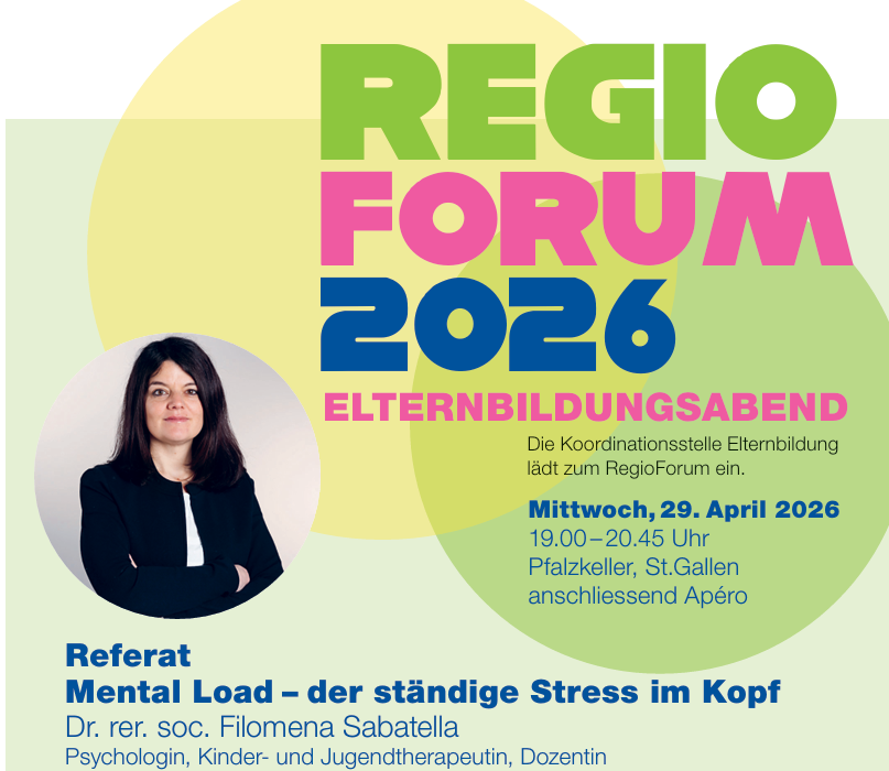 Am Mittwoch, 29. April 2026 um 19.00 Uhr referiert Filomena Sabatella zum Thema «Mental Load – der ständige Stress im Kopf» im Pfalzkeller St.Gallen. Anschliessend wird Regula Immler Riklin das Projekt «Familienzeiten» vorstellen und die musikalische Umrahmung der Talentschule Musikschule St.Gallen rundet das Programm ab. Beim Apéro besteht die Möglichkeit, sich auszutauschen oder sich an den Tischen zu Beratungs- und Familienangeboten zu informieren. Der Anlass ist kostenlos.