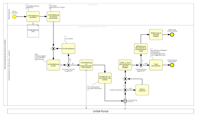 Mitarbeitende der Kantonalen Verwaltung und der Gerichte laden das Formular zum Ausfüllen herunter. Die Unfallmeldung wird anschliessend an folgende E-Mail-Adresse zugestellt: Ticket-Unfall-Korrespondenz@sg.ch